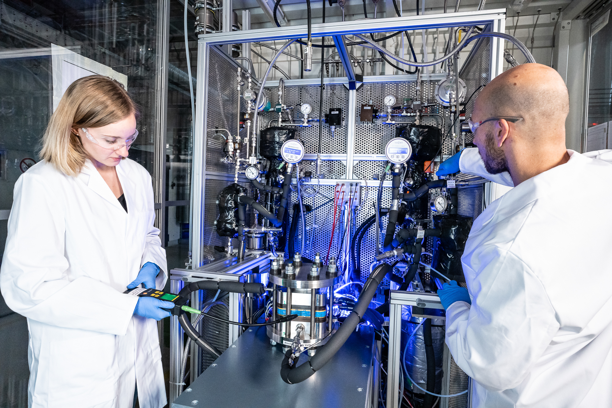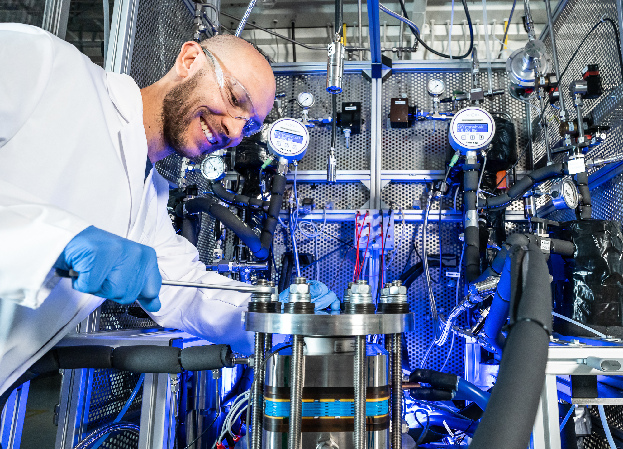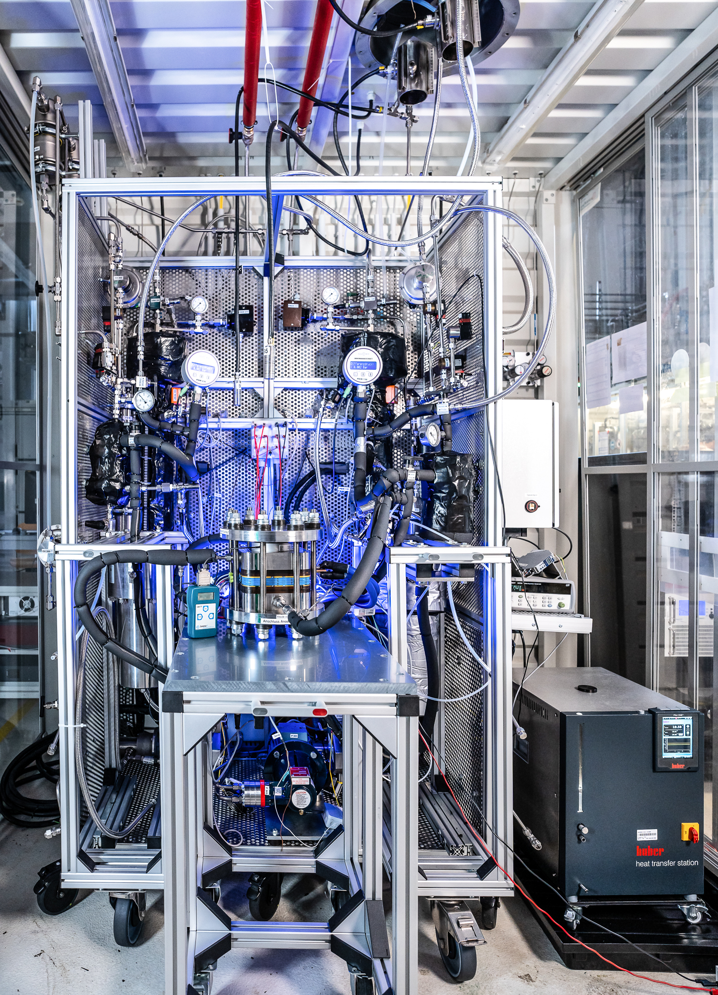 PL 4 provides testing capabilities of PEM electrolysis cells and short stacks. A fully automated test bench enables the evaluation of CCM materials and MEA components under a wide range of operating conditions, including temperature, pressure, and flow rate. Both short-term performance and long-term stability of the materials can be assessed through current–voltage curves and electrochemical impedance spectroscopy. In addition, product gas analysis (H2 in O2) can be performed.