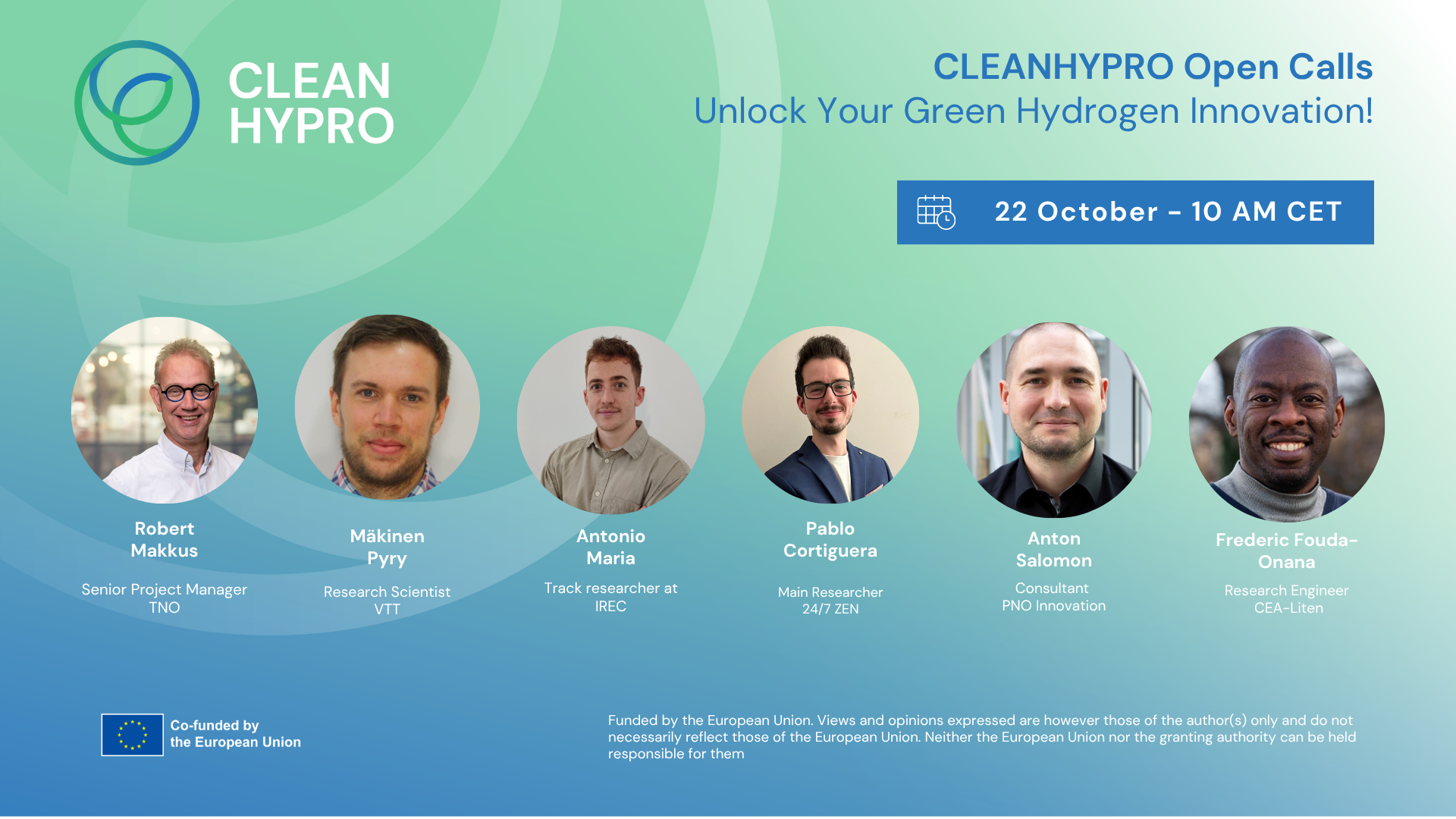 The CLEANHYPRO project successfully hosted its webinar, “CLEANHYPRO Open Calls: Unlock Your Green Hydrogen Innovation!”, on 22nd October 2025. With 49 registrations, the session provided a crucial guide for innovative SMEs and researchers on securing resources from the Open Innovation Test Bed (OITB). The event featured project coordinator Bart Goes, innovation consultants, and six technical experts detailing services available across 9 Pilot Lines.